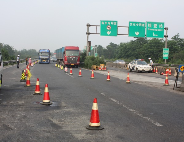 第二、要對施工過程中的實際工程數(shù)量、各工序之間的銜接點、工程的難點、工程進度等與車輛有序通行可能產(chǎn)生的矛盾做好充分的準備。對于本項目,主要問題有三個:其一是由于該路段交通量太大,所以無論是挖補工程還是罩面工程,都必須是白天安排施工作業(yè),夜間則要恢復(fù)道路雙向四車道通行;其二是出京方向K69--K98段無任何分流路線,需要考慮周密的交通管理措施;其三是通過實驗和數(shù)據(jù)收集,準確預(yù)判各類狀況,及早采取措施,避免各類意外情況發(fā)生。為切實做好本項工程,我們在2009年10月、2010年10月和2011年7月在不同路段分別進行了三次試驗性施工。通過試驗我們摸清了如下情況:1、正常通行時單車道能夠通過的最大交通量;2、施工過程中組織好車輛的有序通行至關(guān)重要,倘若有一輛車通行不暢進而造成堵點就需要立即疏導(dǎo),否則就會迅速形成長距離大面積的擁堵;3、壓車超過一定數(shù)量時需要暫停施工放行。通過模擬施工,我們制定了切合實際的應(yīng)急預(yù)案,為施工時及時有效地處置突發(fā)事件提供了極大地幫助。