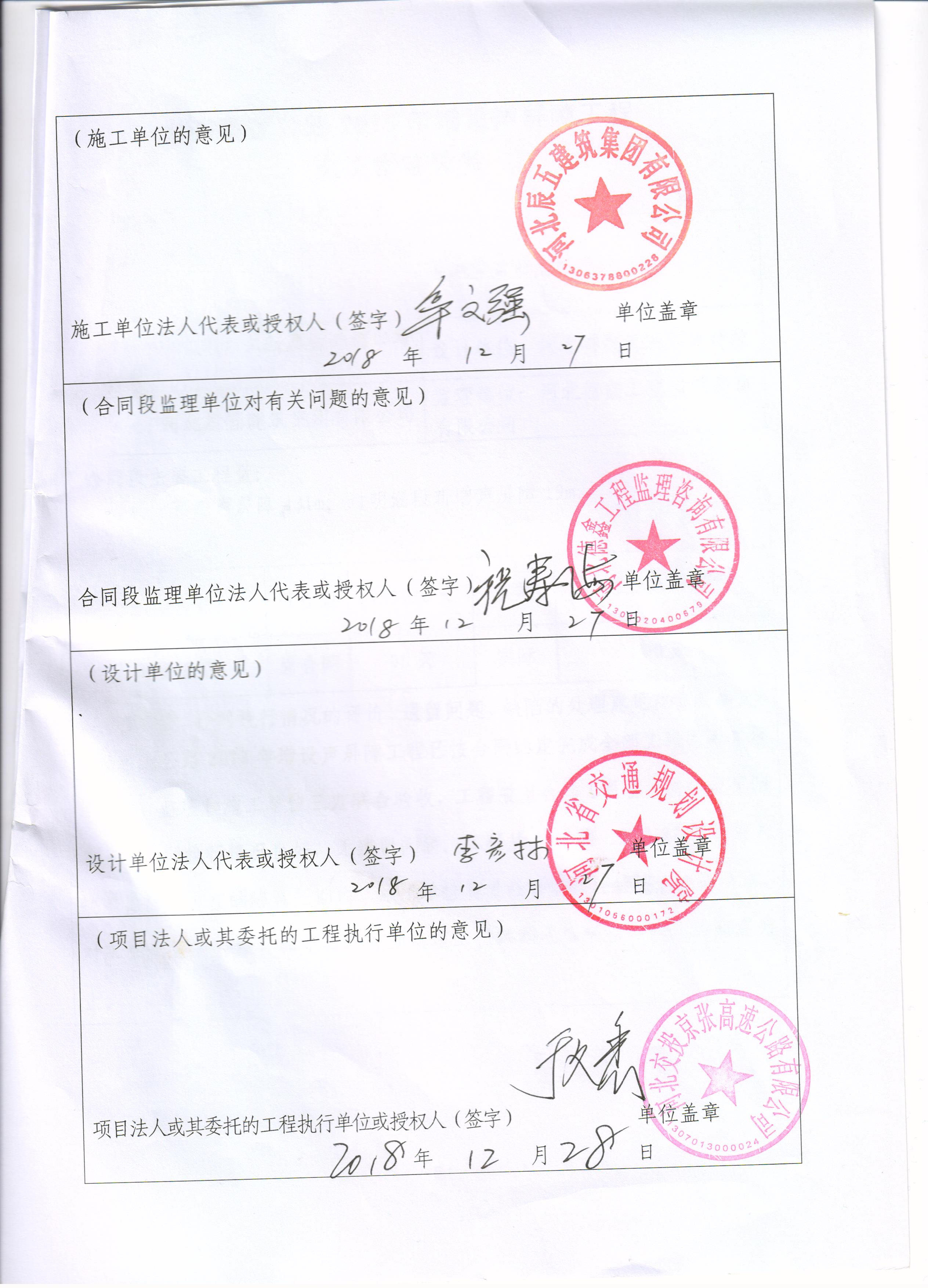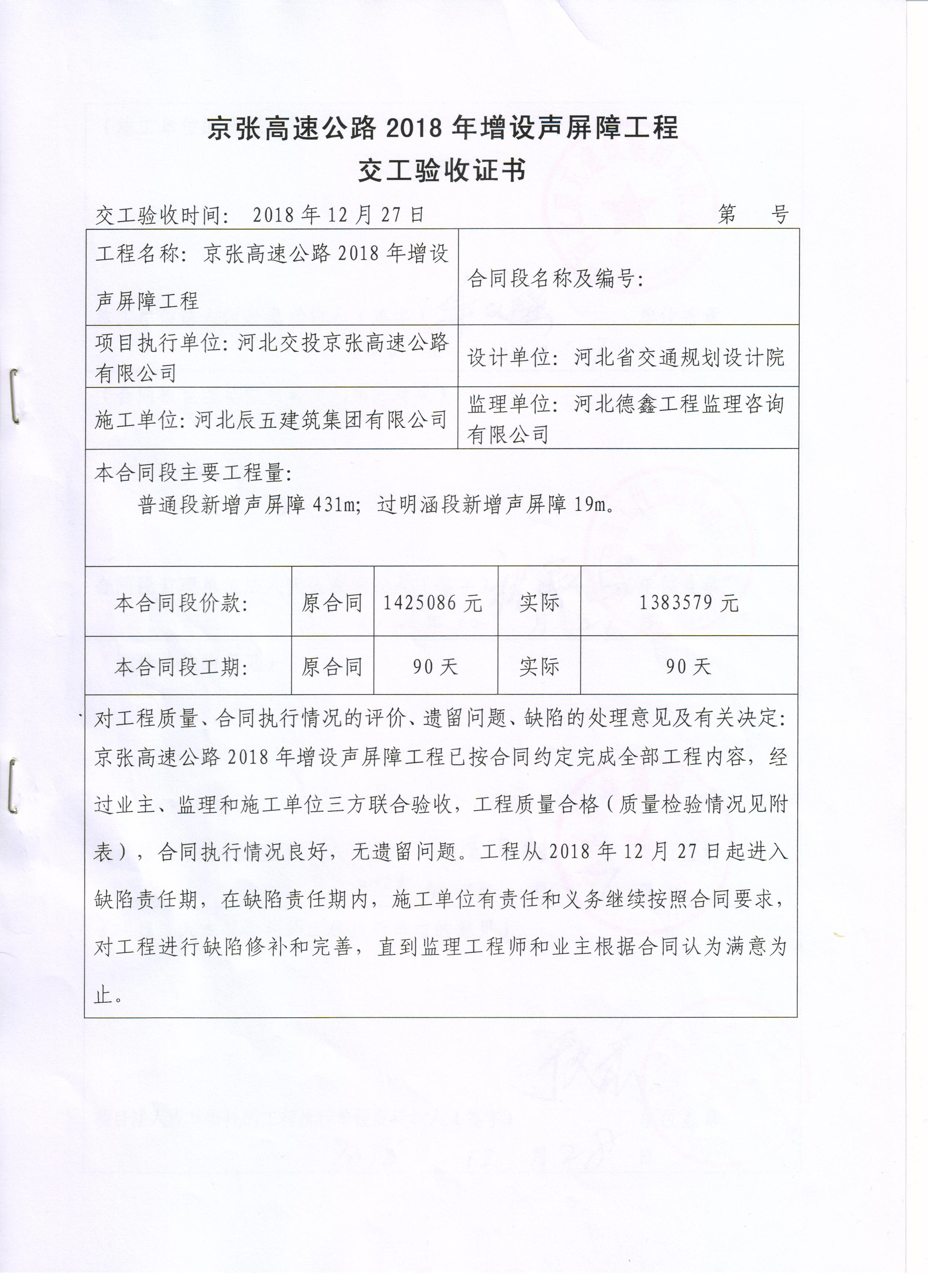 京張高速公路2018年增設(shè)聲屏障工程交工驗收證書