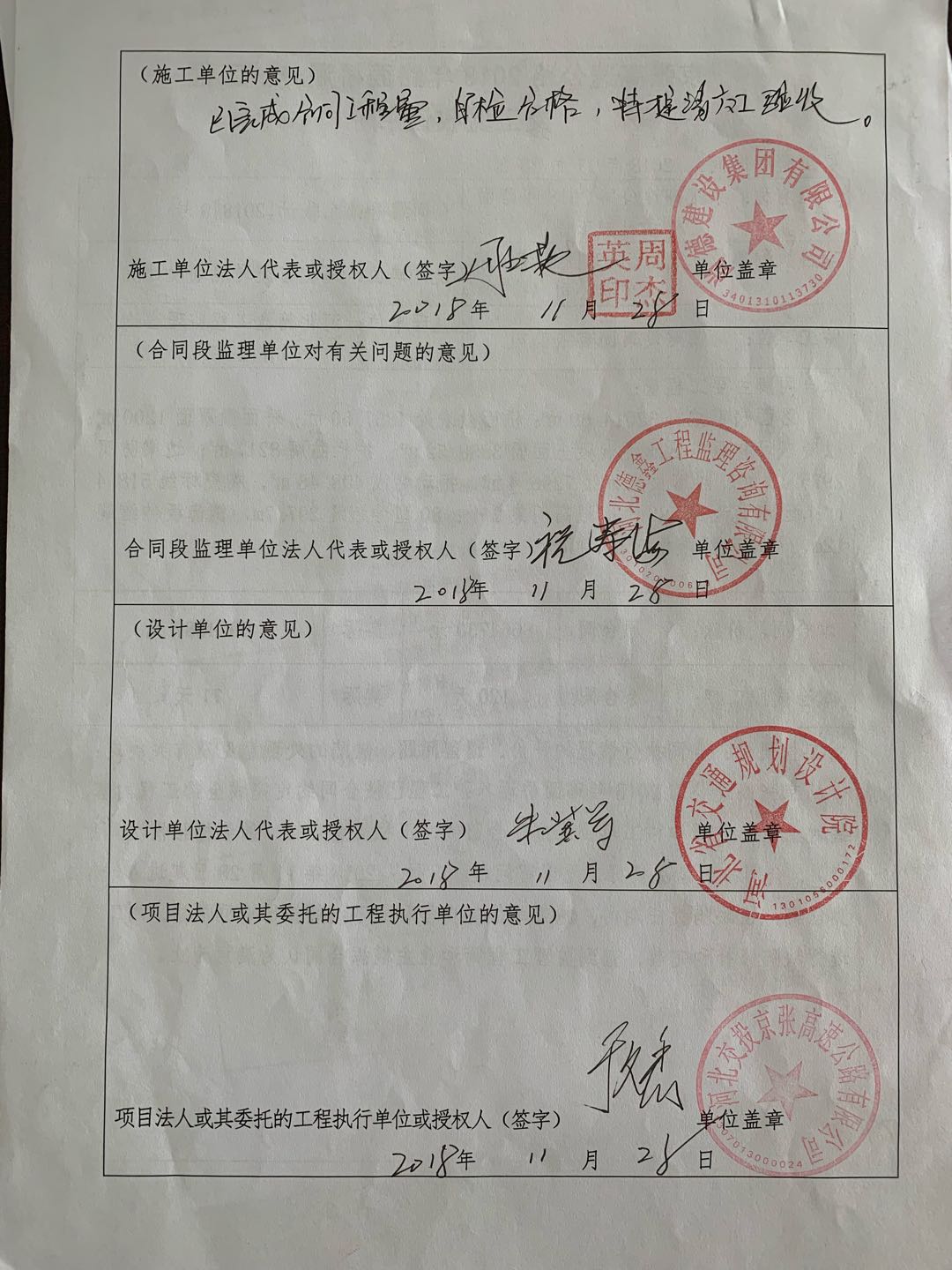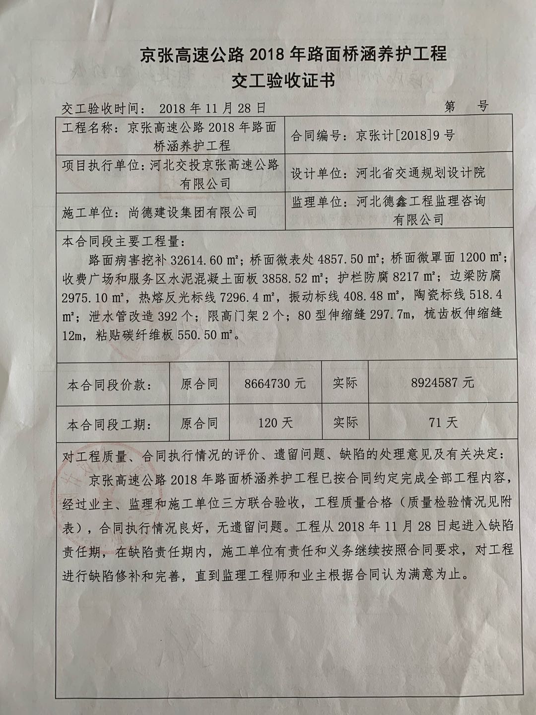 京張高速公路2018年路面橋涵養(yǎng)護工程交工驗收證書