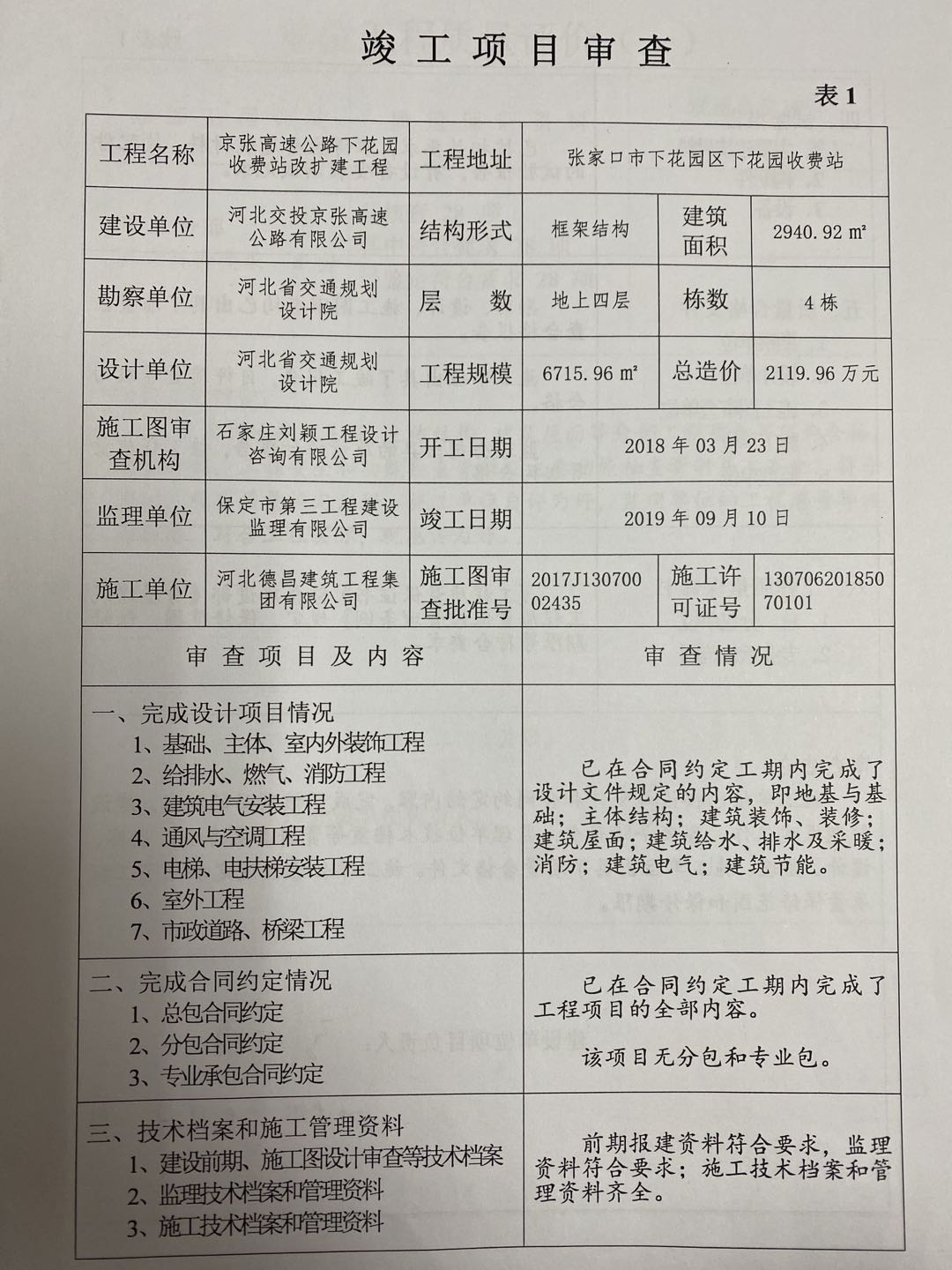 京張高速公路下花園收費(fèi)站改擴(kuò)建工程竣工驗收報告